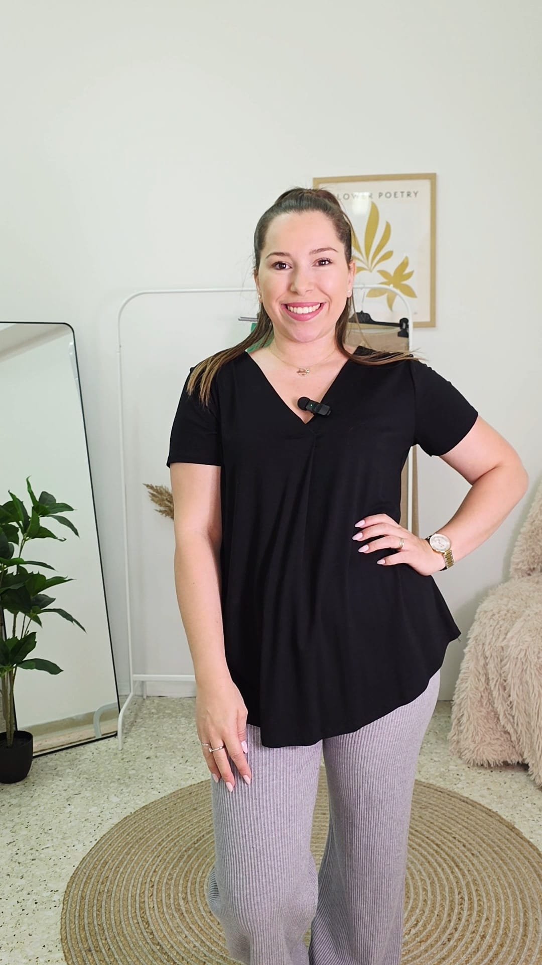 Αέρινο και άνετο σύνολο που συνδυάζει ένα basic t-shirt με V λαιμόκοψη και στρογγυλεμένο τελείωμα, μαζί με μια κομψή wide leg παντελόνα. Ιδανικό για casual chic εμφανίσεις, προσφέροντας στυλ και άνεση όλη μέρα. Συνδυάζεται εύκολα με sneakers για πιο χαλαρό look ή με πέδιλα για πιο κομψή εμφάνιση.